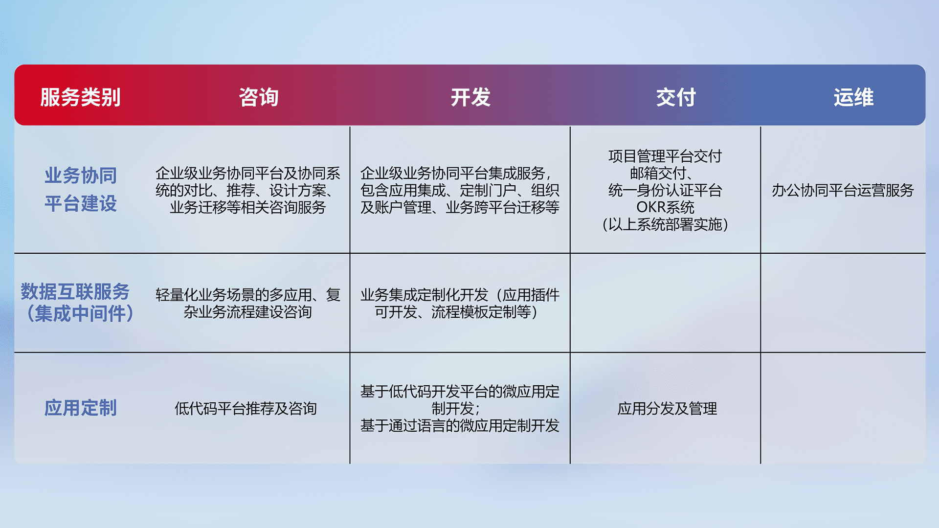 针对钉钉、、、、企微、、IDaas等平台级产品提供产品的规划、、、、方案、、交付、、、、定制化开发等服务,,,,实现如统一协同办公、、、智能客户服务、、、、混合会议管理、、、、智能数据查询、、、等业务场景,,,实现数字化转型。。。